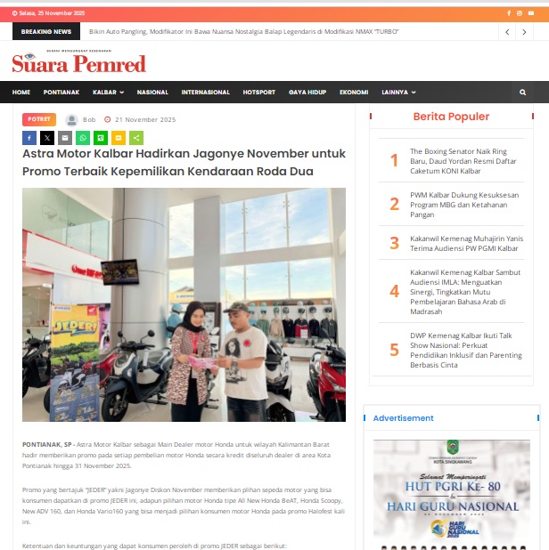 Astra Motor Kalbar Hadirkan Jagonye November untuk Promo Terbaik Kepemilikan Kendaraan Roda Dua by masmul 21 November 2025 in Silahkan kunjungi https://www.suarapemredkalbar.com/read/potret/21112025/astra-motor-kalbar-hadirkan-jagonye-november-untuk-promo-terbaik-kepemilikan-kendaraanroda-dua. You Might Like Regional Public Launching New ADV160 The SUV Pride Grand Launching New PCX 160 Truly Exceptional! Tetap hati-hati ya bro sist berkendara saat hujan.