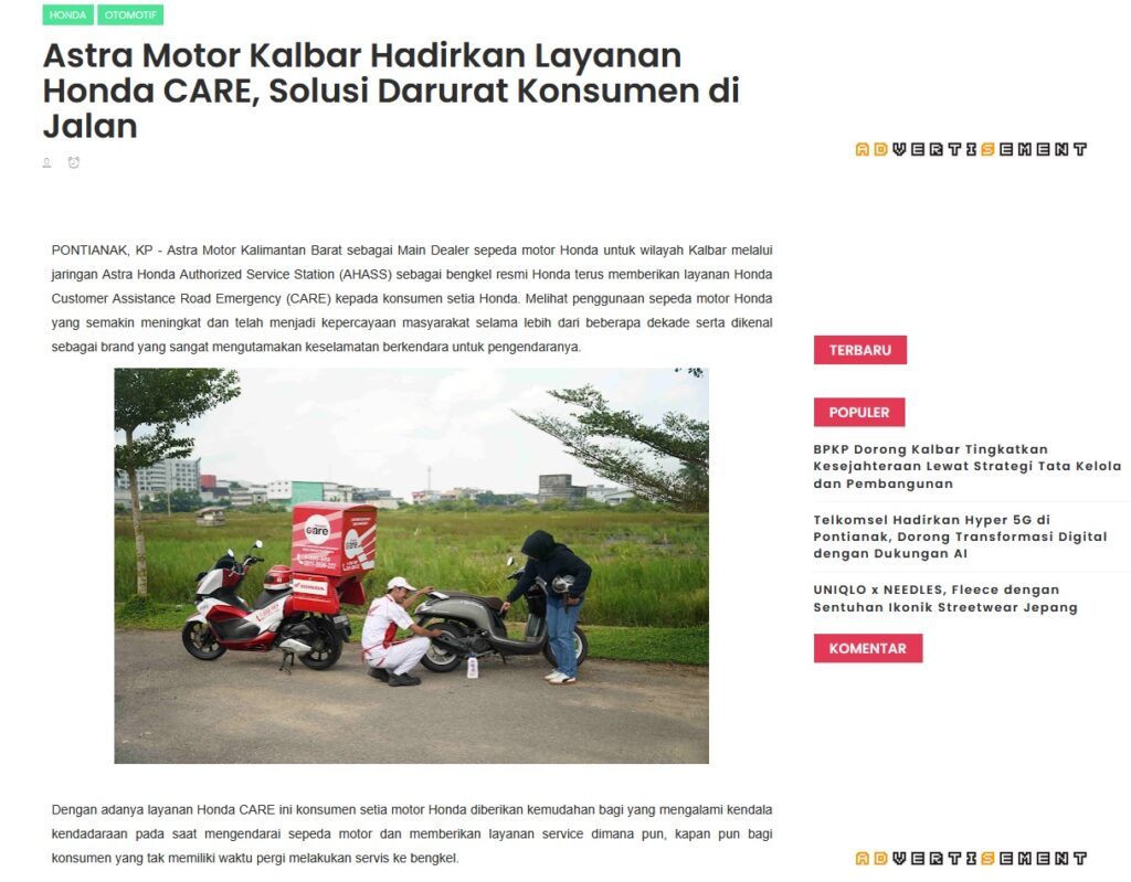 Astra Motor Kalbar Hadirkan Layanan Honda CARE, Solusi Darurat Konsumen di Jalan by Muhammad Arif 1 Oktober 2025 in Silahkan kunjungi https://www.kapuaspost.web.id/2025/10/astra-motor-kalbar-hadirkan-layanan.html. Tags: astra Astra Motor kalbar Astra Motor Pontianak astramotor honda kalbar pontianak sepeda motor You Might Like Regional Public Launching New ADV160 The SUV Pride Grand Launching New PCX 160 Truly Exceptional! Tetap hati-hati ya bro sist berkendara saat hujan.