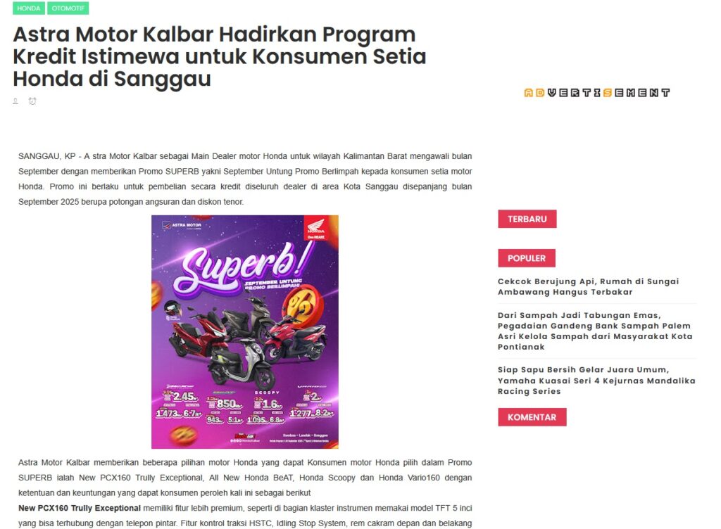 Astra Motor Kalbar Hadirkan Program Kredit Istimewa untuk Konsumen Setia Honda di Sanggau by Muhammad Arif 20 September 2025 in Silahkan kunjungi https://www.kapuaspost.web.id/2025/09/astra-motor-kalbar-hadirkan-program.html. Tags: astra Astra Motor kalbar Astra Motor Pontianak astramotor honda kalbar pontianak sepeda motor You Might Like Regional Public Launching New ADV160 The SUV Pride Grand Launching New PCX 160 Truly Exceptional! Tetap hati-hati ya bro sist berkendara saat hujan.