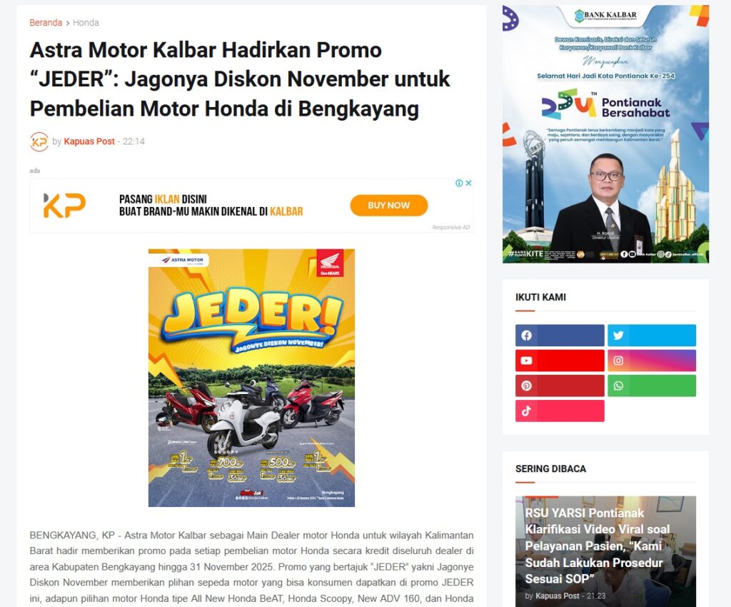 Astra Motor Kalbar Hadirkan Promo “JEDER”: Jagonya Diskon November untuk Pembelian Motor Honda di Bengkayang by Muhammad Arif 8 November 2025 in Silahkan kunjungi https://www.kapuaspost.web.id/2025/11/astra-motor-kalbar-hadirkan-promo-jeder.html. Tags: astra Astra Motor kalbar Astra Motor Pontianak astramotor honda kalbar pontianak sepeda motor You Might Like Regional Public Launching New ADV160 The SUV Pride Grand Launching New PCX 160 Truly Exceptional! Tetap hati-hati ya bro sist berkendara saat hujan.
