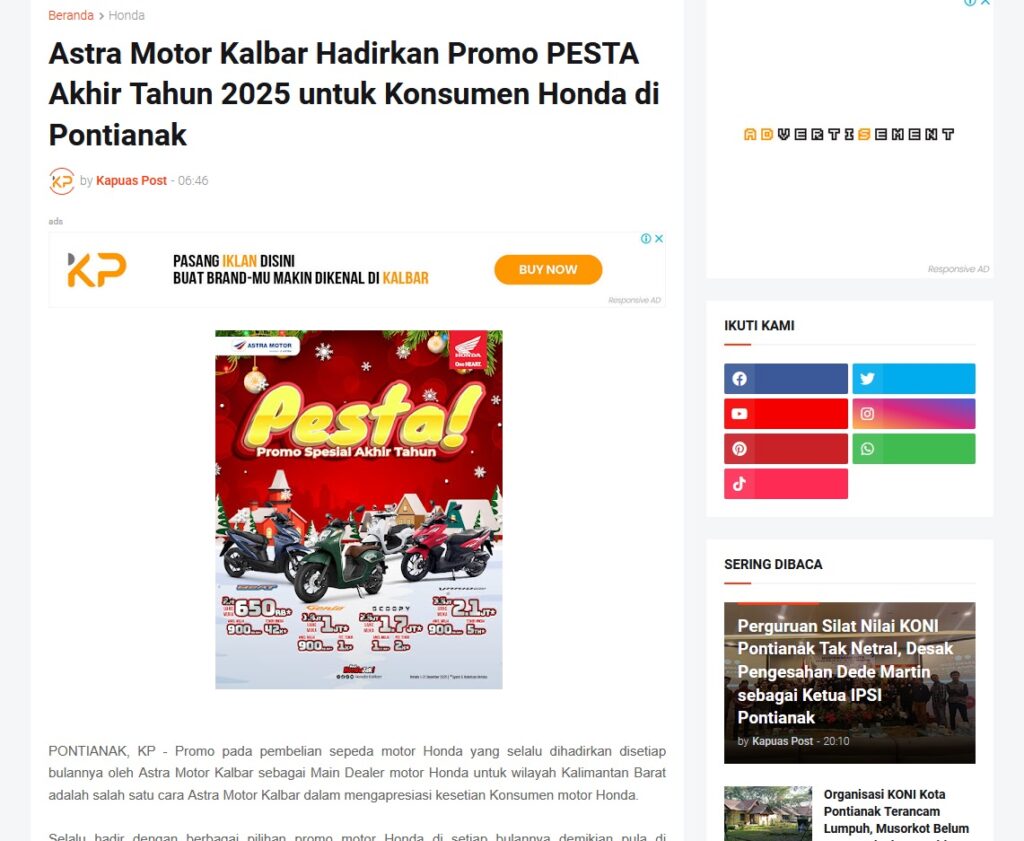 Astra Motor Kalbar Hadirkan Promo PESTA Akhir Tahun 2025 untuk Konsumen Honda di Pontianak by Muhammad Arif 19 Desember 2025 in Silahkan kunjungi https://www.kapuaspost.web.id/2025/12/astra-motor-kalbar-hadirkan-promo-pesta.html. Tags: astra Astra Motor kalbar Astra Motor Pontianak astramotor honda kalbar pontianak sepeda motor You Might Like Regional Public Launching New ADV160 The SUV Pride Grand Launching New PCX 160 Truly Exceptional! Tetap hati-hati ya bro sist berkendara saat hujan.