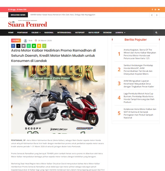 Astra Motor Kalbar Hadirkan Promo Ramadhan di Seluruh Daerah, Kredit Motor Makin Mudah untuk Konsumen di Landak by masmul 28 Maret 2026 in Silahkan kunjungi https://www.suarapemredkalbar.com/read/potret/28032026/astra-motor-kalbar-hadirkan-promo-ramadhan-di-seluruh-daerah-kredit-motor-makin-mudah-untuk-konsumen-di-landak. You Might Like Regional Public Launching New ADV160 The SUV Pride Grand Launching New PCX 160 Truly Exceptional! Tetap hati-hati ya bro sist berkendara saat hujan.