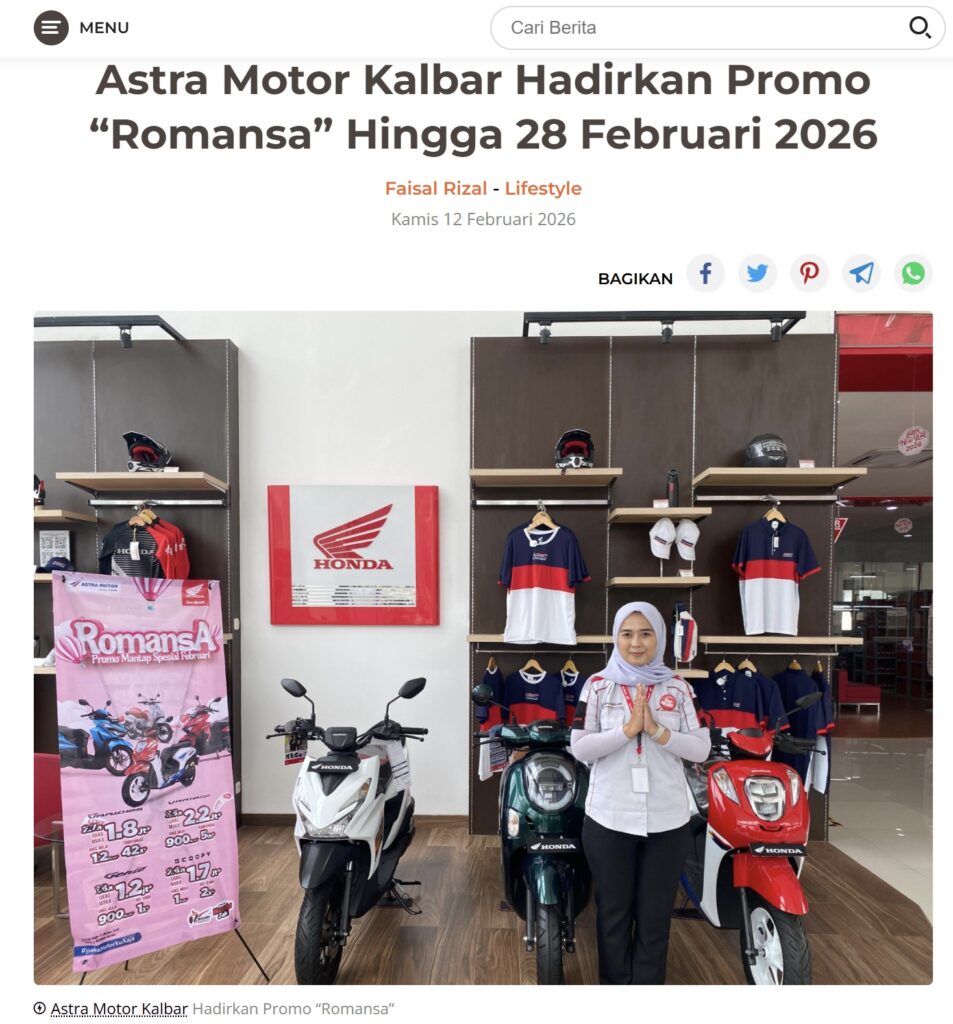 Astra Motor Kalbar Hadirkan Promo “Romansa” Hingga 28 Februari 2026 by Dodi Dodi 12 Februari 2026 in Silahkan kunjungi https://harianberkat.com/2026/02/12/astra-motor-kalbar-hadirkan-promo-romansa-hingga-28-februari-2026/. You Might Like Regional Public Launching New ADV160 The SUV Pride Grand Launching New PCX 160 Truly Exceptional! Tetap hati-hati ya bro sist berkendara saat hujan.