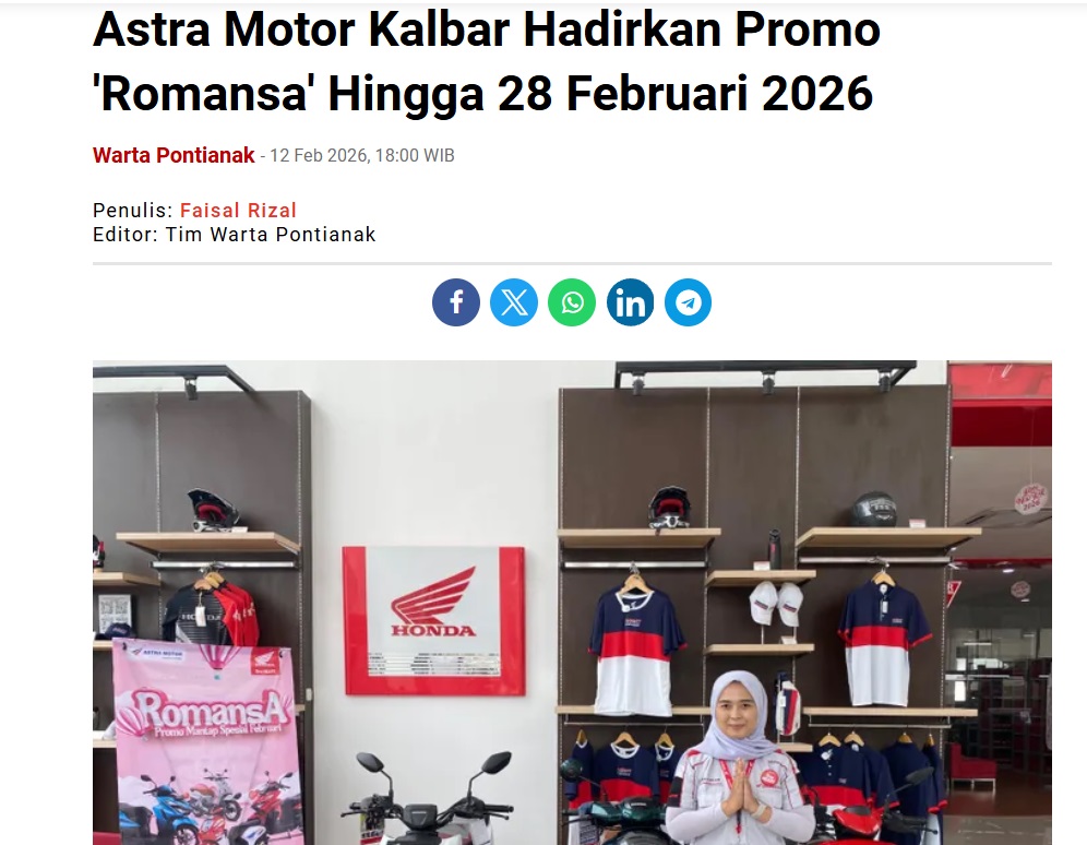 Astra Motor Kalbar Hadirkan Promo ‘Romansa’ Hingga 28 Februari 2026 by Faisal Rizal 12 Februari 2026 in Silahkan kunjungi https://wartapontianak.pikiran-rakyat.com/gaya-hidup/pr-11710002331/astra-motor-kalbar-hadirkan-promo-romansa-hingga-28-februari-2026. You Might Like Regional Public Launching New ADV160 The SUV Pride Grand Launching New PCX 160 Truly Exceptional! Tetap hati-hati ya bro sist berkendara saat hujan.