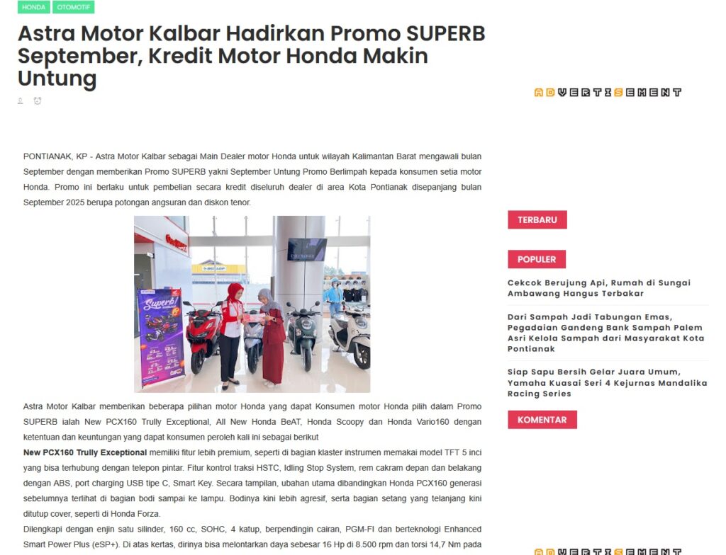 Astra Motor Kalbar Hadirkan Promo SUPERB September, Kredit Motor Honda Makin Untung by Muhammad Arif 28 September 2025 in Silahkan kunjungi https://www.kapuaspost.web.id/2025/09/astra-motor-kalbar-hadirkan-promo_29.html. Tags: astra Astra Motor kalbar Astra Motor Pontianak astramotor honda kalbar pontianak sepeda motor You Might Like Regional Public Launching New ADV160 The SUV Pride Grand Launching New PCX 160 Truly Exceptional! Tetap hati-hati ya bro sist berkendara saat hujan.