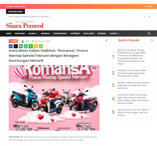 Astra Motor Kalbar Hadirkan “Romansa”, Promo Mantap Spesial Februari dengan Beragam Keuntungan Menarik by masmul 4 Februari 2026 in Silahkan kunjungi https://www.suarapemredkalbar.com/read/potret/04022026/astra-motor-kalbar-hadirkan-romansa-promo-mantap-spesial-februari-dengan-beragam-keuntungan-menarik. You Might Like Regional Public Launching New ADV160 The SUV Pride Grand Launching New PCX 160 Truly Exceptional! Tetap hati-hati ya bro sist berkendara saat hujan.