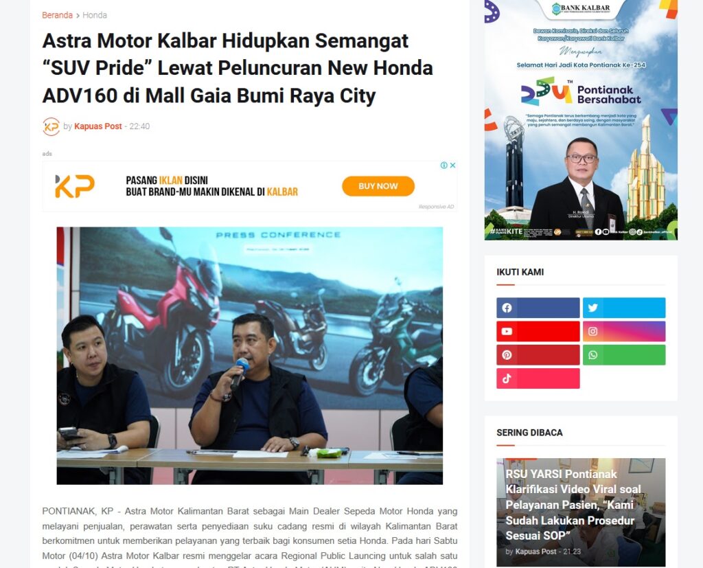 Astra Motor Kalbar Hidupkan Semangat “SUV Pride” Lewat Peluncuran New Honda ADV160 di Mall Gaia Bumi Raya City by Muhammad Arif 16 Oktober 2025 in Silahkan kunjungi https://www.kapuaspost.web.id/2025/10/astra-motor-kalbar-hidupkan-semangat.html. Tags: astra Astra Motor kalbar Astra Motor Pontianak astramotor honda kalbar pontianak sepeda motor You Might Like Regional Public Launching New ADV160 The SUV Pride Grand Launching New PCX 160 Truly Exceptional! Tetap hati-hati ya bro sist berkendara saat hujan.