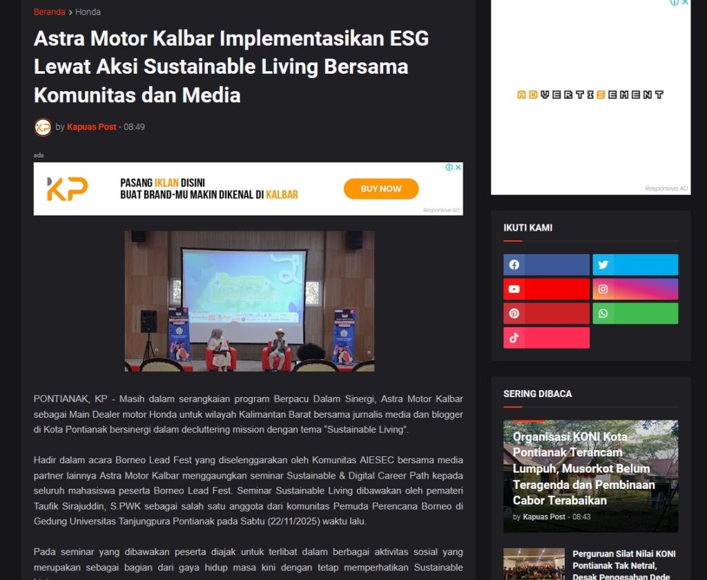 Astra Motor Kalbar Implementasikan ESG Lewat Aksi Sustainable Living Bersama Komunitas dan Media by Muhammad Arif 16 Desember 2025 in Silahkan kunjungi https://www.kapuaspost.web.id/2025/12/astra-motor-kalbar-implementasikan-esg.html. Tags: astra Astra Motor kalbar Astra Motor Pontianak astramotor honda kalbar pontianak sepeda motor You Might Like Regional Public Launching New ADV160 The SUV Pride Grand Launching New PCX 160 Truly Exceptional! Tetap hati-hati ya bro sist berkendara saat hujan.