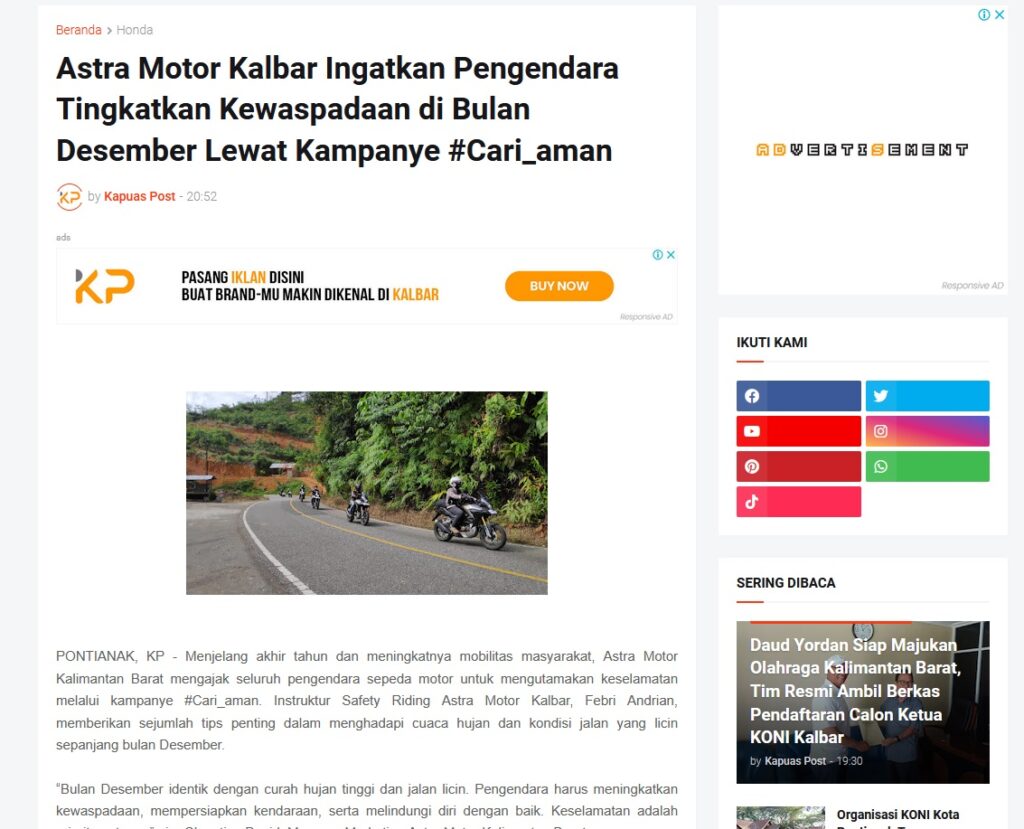 Astra Motor Kalbar Ingatkan Pengendara Tingkatkan Kewaspadaan di Bulan Desember Lewat Kampanye #Cari_aman by Muhammad Arif 25 November 2025 in Silahkan kunjungi https://www.kapuaspost.web.id/2025/11/astra-motor-kalbar-ingatkan-pengendara.html. Tags: astra Astra Motor kalbar Astra Motor Pontianak astramotor honda kalbar pontianak sepeda motor You Might Like Regional Public Launching New ADV160 The SUV Pride Grand Launching New PCX 160 Truly Exceptional! Tetap hati-hati ya bro sist berkendara saat hujan.