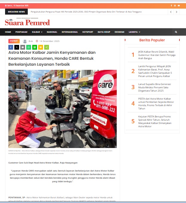 Astra Motor Kalbar Jamin Kenyamanan dan Keamanan Konsumen, Honda CARE Bentuk Berkelanjutan Layanan Terbaik Photo of Astra Motor Kalbar Jamin Kenyamanan dan Keamanan Konsumen, Honda CARE Bentuk Berkelanjutan Layanan Terbaik by masmul 14 Desember 2025 in Silahkan kunjungi https://www.suarapemredkalbar.com/read/potret/14122025/astra-motor-kalbar-jamin-kenyamanan-dan-keamanan-konsumen-honda-care-bentuk-berkelanjutan-layanan-terbaik. You Might Like Regional Public Launching New ADV160 The SUV Pride Grand Launching New PCX 160 Truly Exceptional! Tetap hati-hati ya bro sist berkendara saat hujan.