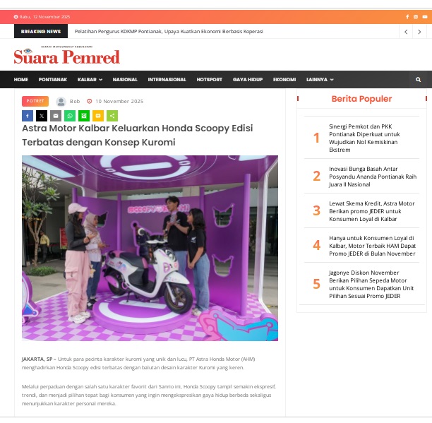Astra Motor Kalbar Keluarkan Honda Scoopy Edisi Terbatas dengan Konsep Kuromi by masmul 10 November 2025 in Silahkan kunjungi https://www.suarapemredkalbar.com/read/potret/10112025/astra-motor-kalbar-keluarkan-honda-scoopy-edisi-terbatas-dengan-konsep-kuromi. You Might Like Regional Public Launching New ADV160 The SUV Pride Grand Launching New PCX 160 Truly Exceptional! Tetap hati-hati ya bro sist berkendara saat hujan.