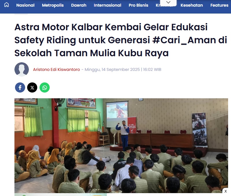 Astra Motor Kalbar Kembai Gelar Edukasi Safety Riding untuk Generasi #Cari_Aman di Sekolah Taman Mulia Kubu Raya by Aristono Edi Kiswantoro 14 September 2025 in Silahkan kunjungi https://pontianakpost.jawapos.com/pro-bisnis/1466570124/astra-motor-kalbar-kembai-gelar-edukasi-safety-riding-untuk-generasi-cari_aman-di-sekolah-taman-mulia-kubu-raya. You Might Like Regional Public Launching New ADV160 The SUV Pride Grand Launching New PCX 160 Truly Exceptional! Tetap hati-hati ya bro sist berkendara saat hujan.