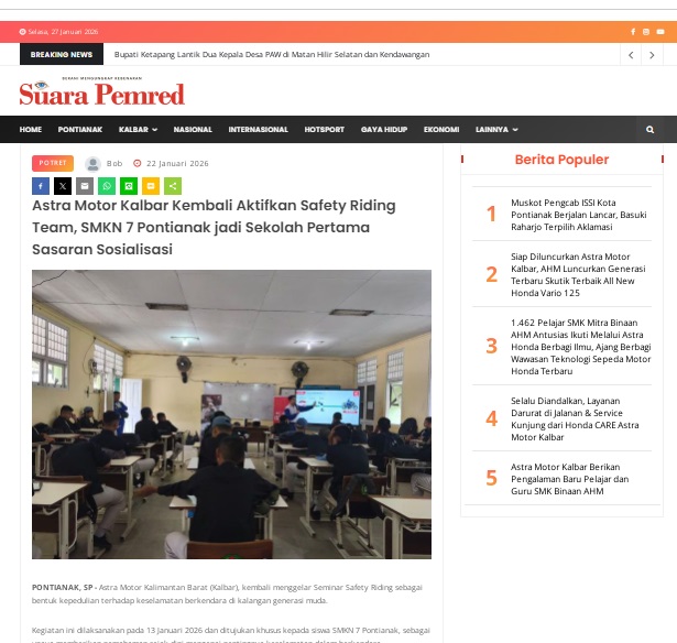 Astra Motor Kalbar Kembali Aktifkan Safety Riding Team, SMKN 7 Pontianak jadi Sekolah Pertama Sasaran Sosialisasi by masmul 22 Januari 2026 in Silahkan kunjungi https://www.suarapemredkalbar.com/read/potret/22012026/astra-motor-kalbar-kembali-aktifkan-safety-riding-team-smkn-7-pontianak-jadi-sekolah-pertama-sasaran-sosialisasi. You Might Like Regional Public Launching New ADV160 The SUV Pride Grand Launching New PCX 160 Truly Exceptional! Tetap hati-hati ya bro sist berkendara saat hujan.