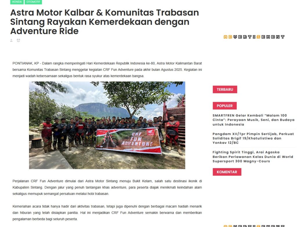 Astra Motor Kalbar & Komunitas Trabasan Sintang Rayakan Kemerdekaan dengan Adventure Ride by Muhammad Arif 5 September 2025 in Silahkan kunjungi https://www.kapuaspost.web.id/2025/09/astra-motor-kalbar-komunitas-trabasan.html. Tags: astra Astra Motor kalbar Astra Motor Pontianak astramotor honda kalbar pontianak sepeda motor You Might Like Regional Public Launching New ADV160 The SUV Pride Grand Launching New PCX 160 Truly Exceptional! Tetap hati-hati ya bro sist berkendara saat hujan.
