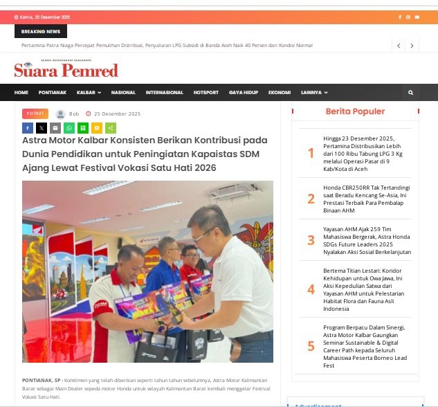Astra Motor Kalbar Konsisten Berikan Kontribusi pada Dunia Pendidikan untuk Peningiatan Kapaistas SDM Ajang Lewat Festival Vokasi Satu Hati 2026 by masmul 25 Desember 2025 in Silahkan kunjungi https://www.suarapemredkalbar.com/read/potret/25122025/astra-motor-kalbar-konsisten-berikan-kontribusi-pada-dunia-pendidikan-untuk-peningiatan-kapaistas-sdm-ajang-lewat-festival-vokasi-satu-hati-2026. You Might Like Regional Public Launching New ADV160 The SUV Pride Grand Launching New PCX 160 Truly Exceptional! Tetap hati-hati ya bro sist berkendara saat hujan.