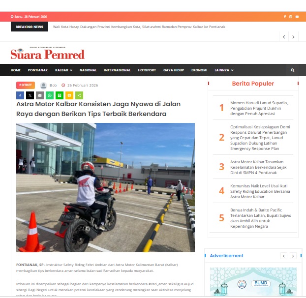 Astra Motor Kalbar Konsisten Jaga Nyawa di Jalan Raya dengan Berikan Tips Terbaik Berkendara by masmul 26 Februari 2026 in Silahkan kunjungi https://www.suarapemredkalbar.com/read/potret/26022026/astra-motor-kalbar-konsisten-jaga-nyawa-di-jalan-raya-dengan-berikan-tips-terbaik-berkendara. You Might Like Regional Public Launching New ADV160 The SUV Pride Grand Launching New PCX 160 Truly Exceptional! Tetap hati-hati ya bro sist berkendara saat hujan.