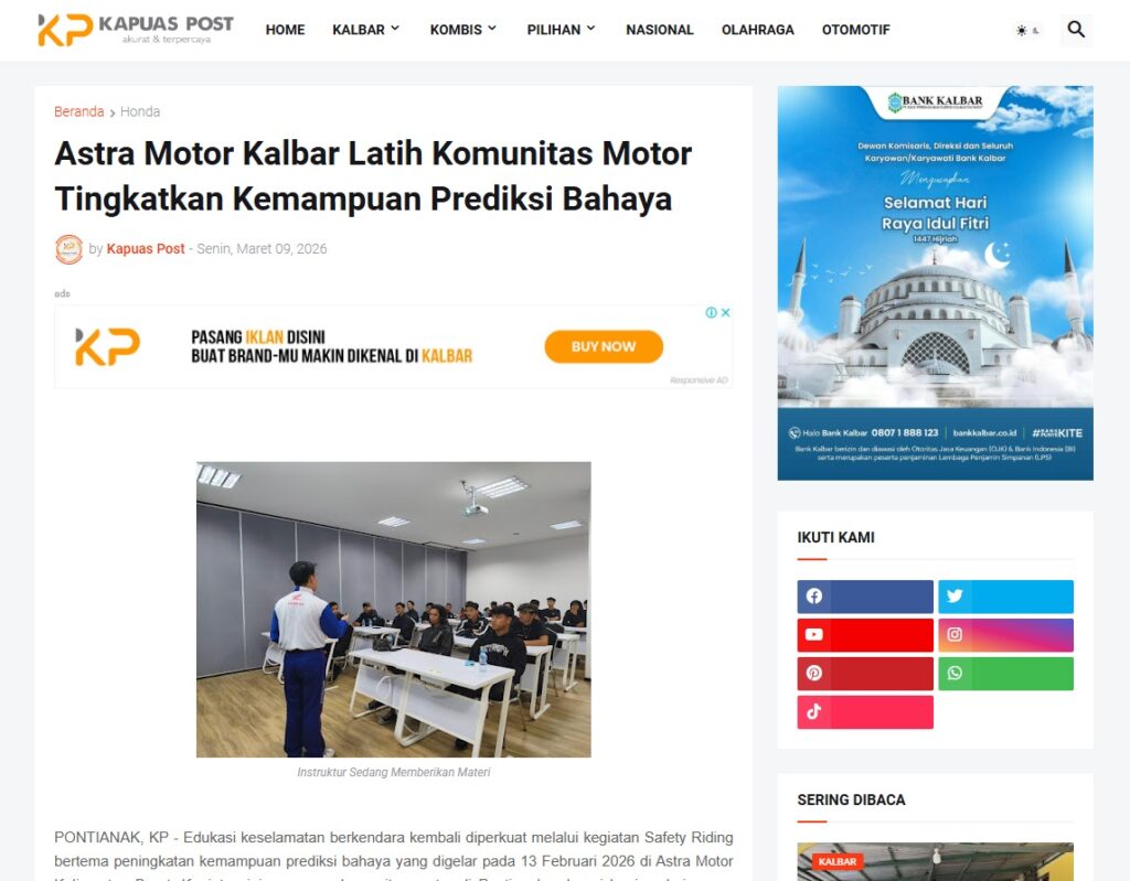 Astra Motor Kalbar Latih Komunitas Motor Tingkatkan Kemampuan Prediksi Bahaya by Muhammad Arif 9 Maret 2026 in Silahkan kunjungi https://www.kapuaspost.web.id/2026/03/astra-motor-kalbar-latih-komunitas_01055616943.html. Tags: astra Astra Motor kalbar Astra Motor Pontianak astramotor honda kalbar pontianak sepeda motor You Might Like Regional Public Launching New ADV160 The SUV Pride Grand Launching New PCX 160 Truly Exceptional! Tetap hati-hati ya bro sist berkendara saat hujan.