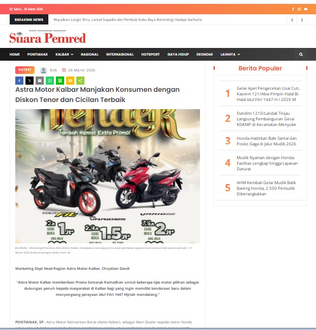 Astra Motor Kalbar Manjakan Konsumen dengan Diskon Tenor dan Cicilan Terbaik by masmul 26 Maret 2026 in Silahkan kunjungi https://www.suarapemredkalbar.com/read/potret/26032026/astra-motor-kalbar-manjakan-konsumen-dengan-diskon-tenor-dan-cicilan-terbaik-1. You Might Like Regional Public Launching New ADV160 The SUV Pride Grand Launching New PCX 160 Truly Exceptional! Tetap hati-hati ya bro sist berkendara saat hujan.