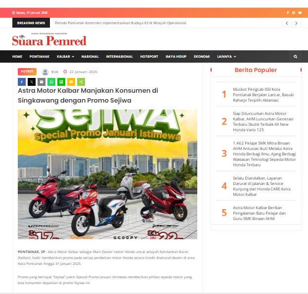 Astra Motor Kalbar Manjakan Konsumen di Singkawang dengan Promo Sejiwa by masmul 22 Januari 2026 in Silahkan kunjungi https://www.suarapemredkalbar.com/read/potret/22012026/astra-motor-kalbar-manjakan-konsumen-di-singkawang-dengan-promo-sejiwa. You Might Like Regional Public Launching New ADV160 The SUV Pride Grand Launching New PCX 160 Truly Exceptional! Tetap hati-hati ya bro sist berkendara saat hujan.