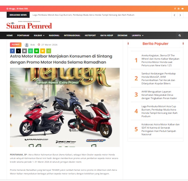 Astra Motor Kalbar Manjakan Konsumen di Sintang dengan Promo Motor Honda Selama Ramadhan by masmul 27 Maret 2026 in Silahkan kunjungi https://www.suarapemredkalbar.com/read/potret/27032026/astra-motor-kalbar-manjakan-konsumen-di-sintang-dengan-promo-motor-honda-selama-ramadhan. You Might Like Regional Public Launching New ADV160 The SUV Pride Grand Launching New PCX 160 Truly Exceptional! Tetap hati-hati ya bro sist berkendara saat hujan.