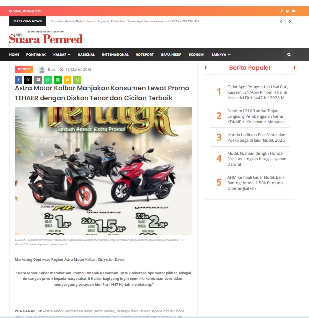 Astra Motor Kalbar Manjakan Konsumen Lewat Promo TEHAER dengan Diskon Tenor dan Cicilan Terbaik by masmul 26 Maret 2026 in Silahkan kunjungi https://www.suarapemredkalbar.com/read/potret/26032026/astra-motor-kalbar-manjakan-konsumen-lewat-promo-tehaer-dengan-diskon-tenor-dan-cicilan-terbaik. You Might Like Regional Public Launching New ADV160 The SUV Pride Grand Launching New PCX 160 Truly Exceptional! Tetap hati-hati ya bro sist berkendara saat hujan.