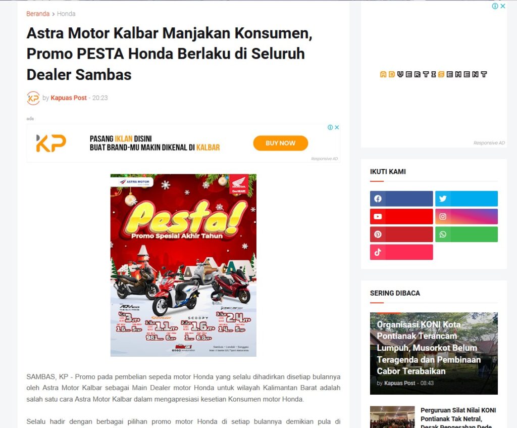 Astra Motor Kalbar Manjakan Konsumen, Promo PESTA Honda Berlaku di Seluruh Dealer Sambas by Muhammad Arif 10 Desember 2025 in Silahkan kunjungi https://www.kapuaspost.web.id/2025/12/astra-motor-kalbar-manjakan-konsumen.html. Tags: astra Astra Motor kalbar Astra Motor Pontianak astramotor honda kalbar pontianak sepeda motor You Might Like Regional Public Launching New ADV160 The SUV Pride Grand Launching New PCX 160 Truly Exceptional! Tetap hati-hati ya bro sist berkendara saat hujan.