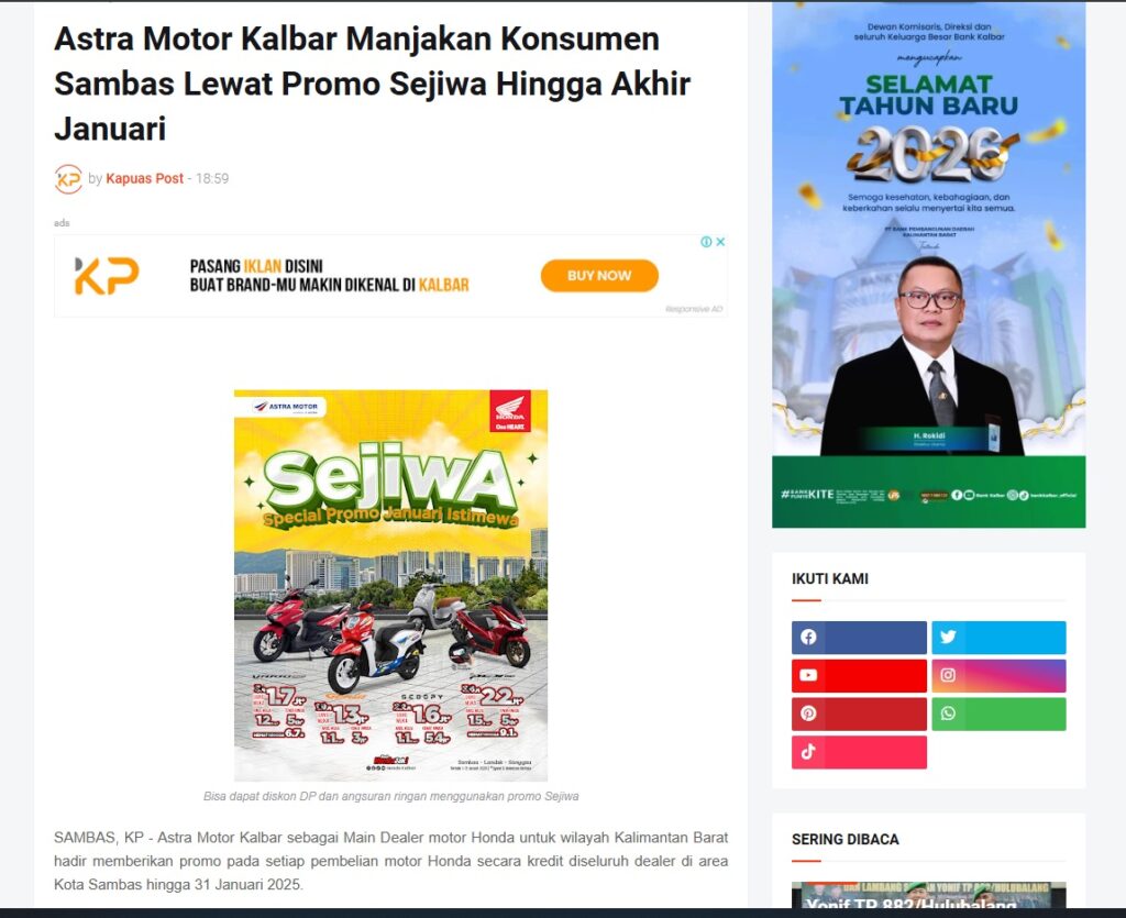 Astra Motor Kalbar Manjakan Konsumen Sambas Lewat Promo Sejiwa Hingga Akhir Januari by Muhammad Arif 16 Januari 2026 in Silahkan kunjungi https://www.kapuaspost.web.id/2026/01/astra-motor-kalbar-manjakan-konsumen.html. Tags: astra Astra Motor kalbar Astra Motor Pontianak astramotor honda kalbar pontianak sepeda motor You Might Like Regional Public Launching New ADV160 The SUV Pride Grand Launching New PCX 160 Truly Exceptional! Tetap hati-hati ya bro sist berkendara saat hujan.
