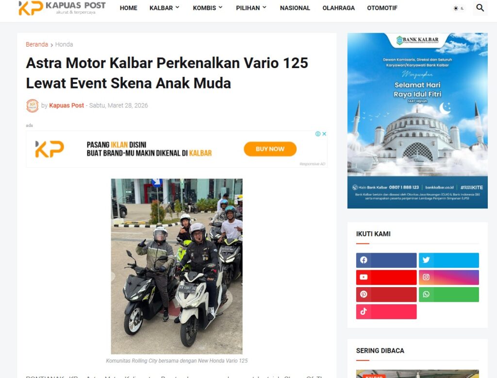 Astra Motor Kalbar Perkenalkan Vario 125 Lewat Event Skena Anak Muda by Muhammad Arif 28 Maret 2026 in Silahkan kunjungi https://www.kapuaspost.web.id/2026/03/astra-motor-kalbar-perkenalkan-vario.html. Tags: astra Astra Motor kalbar Astra Motor Pontianak astramotor honda kalbar pontianak sepeda motor You Might Like Regional Public Launching New ADV160 The SUV Pride Grand Launching New PCX 160 Truly Exceptional! Tetap hati-hati ya bro sist berkendara saat hujan.