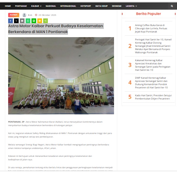 Astra Motor Kalbar Perkuat Budaya Keselamatan Berkendara di MAN 1 Pontianak by masmul 23 Oktober 2025 in Silahkan kunjungi https://www.suarapemredkalbar.com/read/potret/23102025/astra-motor-kalbar-perkuat-budaya-keselamatan-berkendara-di-man-1-pontianak. You Might Like Regional Public Launching New ADV160 The SUV Pride Grand Launching New PCX 160 Truly Exceptional! Tetap hati-hati ya bro sist berkendara saat hujan.