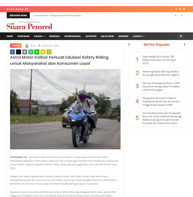Astra Motor Kalbar Perkuat Edukasi Safety Riding untuk Masyarakat dan Konsumen Loyal by masmul 28 Januari 2026 in Silahkan kunjungi https://www.suarapemredkalbar.com/read/potret/28012026/astra-motor-kalbar-perkuat-edukasi-safety-riding-untuk-masyarakat-dan-konsumen-loyal. You Might Like Regional Public Launching New ADV160 The SUV Pride Grand Launching New PCX 160 Truly Exceptional! Tetap hati-hati ya bro sist berkendara saat hujan.