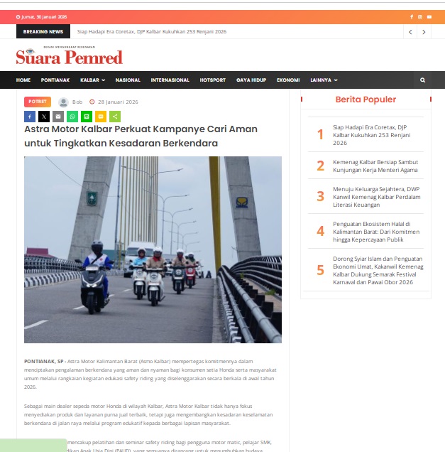 Astra Motor Kalbar Perkuat Kampanye Cari Aman untuk Tingkatkan Kesadaran Berkendara by masmul 28 Januari 2026 in Silahkan kunjungi https://www.suarapemredkalbar.com/read/potret/28012026/astra-motor-kalbar-perkuat-kampanye-cari-aman-untuk-tingkatkan-kesadaran-berkendara. You Might Like Regional Public Launching New ADV160 The SUV Pride Grand Launching New PCX 160 Truly Exceptional! Tetap hati-hati ya bro sist berkendara saat hujan.