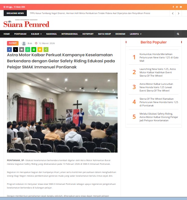 Astra Motor Kalbar Perkuat Kampanye Keselamatan Berkendara dengan Gelar Safety Riding Edukasi pada Pelajar SMAK Immanuel Pontianak by masmul 12 Maret 2026 in Silahkan kunjungi https://www.suarapemredkalbar.com/read/potret/12032026/astra-motor-kalbar-perkuat-kampanye-keselamatan-berkendara-dengan-gelar-safety-riding-edukasi-pada-pelajar-smak-immanuel-pontianak. You Might Like Regional Public Launching New ADV160 The SUV Pride Grand Launching New PCX 160 Truly Exceptional! Tetap hati-hati ya bro sist berkendara saat hujan.