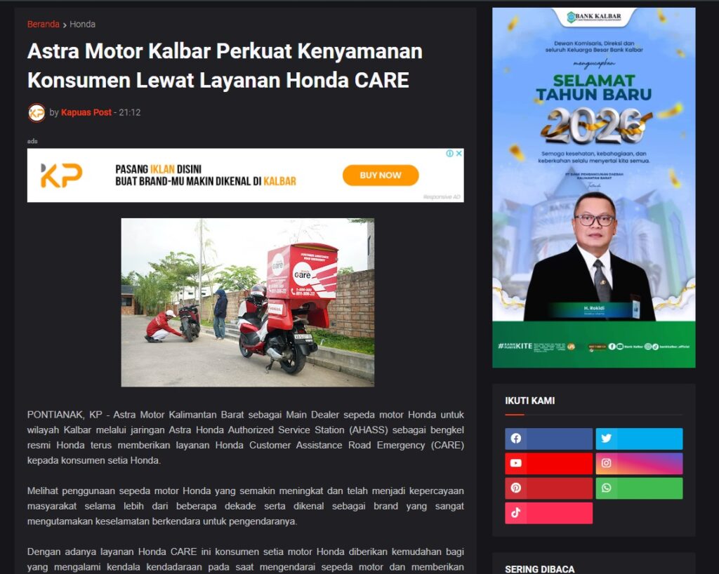 Astra Motor Kalbar Perkuat Kenyamanan Konsumen Lewat Layanan Honda CARE by Muhammad Arif 1 Januari 2026 in Silahkan kunjungi https://www.kapuaspost.web.id/2026/01/astra-motor-kalbar-perkuat-kenyamanan.html. Tags: astra Astra Motor kalbar Astra Motor Pontianak astramotor honda kalbar pontianak sepeda motor You Might Like Regional Public Launching New ADV160 The SUV Pride Grand Launching New PCX 160 Truly Exceptional! Tetap hati-hati ya bro sist berkendara saat hujan.