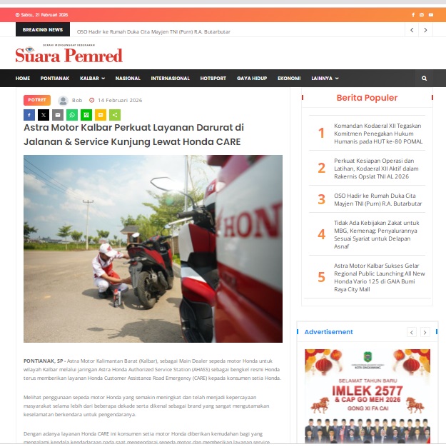 Astra Motor Kalbar Perkuat Layanan Darurat di Jalanan & Service Kunjung Lewat Honda CARE by masmul 14 Februari 2026 in Silahkan kunjungi https://www.suarapemredkalbar.com/read/potret/14022026/astra-motor-kalbarperkuat-layanan-darurat-di-jalanan-service-kunjung-lewat-honda-care. You Might Like Regional Public Launching New ADV160 The SUV Pride Grand Launching New PCX 160 Truly Exceptional! Tetap hati-hati ya bro sist berkendara saat hujan.