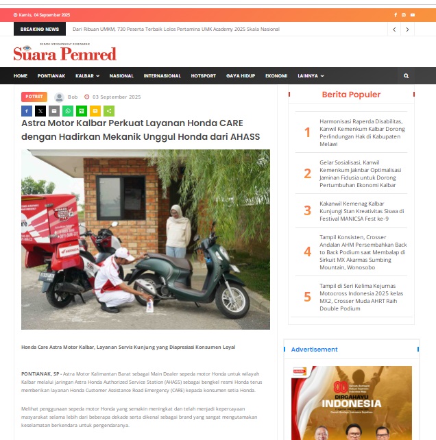 Astra Motor Kalbar Perkuat Layanan Honda CARE dengan Hadirkan Mekanik Unggul Honda dari AHASS by masmul 3 September 2025 in Silahkan kunjungi https://www.suarapemredkalbar.com/read/potret/03092025/astra-motor-kalbar-perkuat-layanan-honda-care-dengan-hadirkan-mekanik-unggul-honda-dari-ahass. You Might Like Regional Public Launching New ADV160 The SUV Pride Grand Launching New PCX 160 Truly Exceptional! Tetap hati-hati ya bro sist berkendara saat hujan.