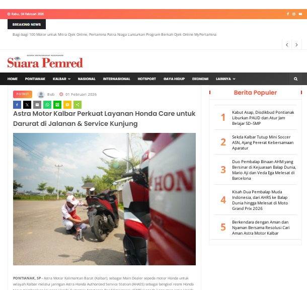 Astra Motor Kalbar Perkuat Layanan Honda Care untuk Darurat di Jalanan & Service Kunjung by masmul 1 Februari 2026 in Silahkan kunjungi https://www.suarapemredkalbar.com/read/potret/01022026/astra-motor-kalbar-perkuat-layanan-honda-care-untuk-darurat-di-jalanan-service-kunjung. You Might Like Regional Public Launching New ADV160 The SUV Pride Grand Launching New PCX 160 Truly Exceptional! Tetap hati-hati ya bro sist berkendara saat hujan.