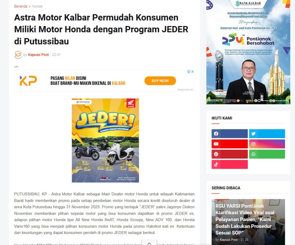 Astra Motor Kalbar Permudah Konsumen Miliki Motor Honda dengan Program JEDER di Putussibau by Muhammad Arif 10 November 2025 in Silahkan kunjungi https://www.kapuaspost.web.id/2025/11/astra-motor-kalbar-permudah-konsumen.html. Tags: astra Astra Motor kalbar Astra Motor Pontianak astramotor honda kalbar pontianak sepeda motor You Might Like Regional Public Launching New ADV160 The SUV Pride Grand Launching New PCX 160 Truly Exceptional! Tetap hati-hati ya bro sist berkendara saat hujan.