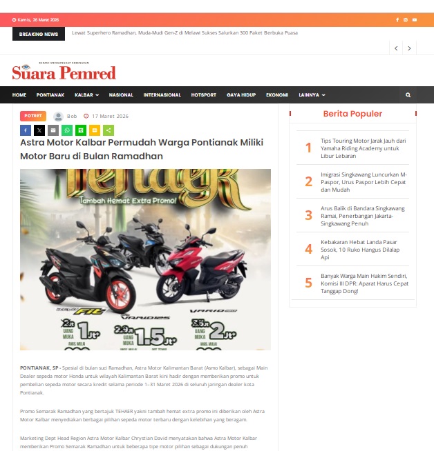Astra Motor Kalbar Permudah Warga Pontianak Miliki Motor Baru di Bulan Ramadhan by masmul 17 Maret 2026 in Silahkan kunjungi https://www.suarapemredkalbar.com/read/potret/17032026/astra-motor-kalbar-permudah-warga-pontianak-miliki-motor-baru-di-bulan-ramadhan. You Might Like Regional Public Launching New ADV160 The SUV Pride Grand Launching New PCX 160 Truly Exceptional! Tetap hati-hati ya bro sist berkendara saat hujan.