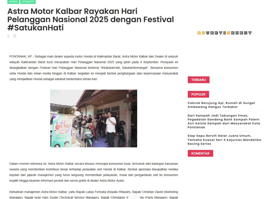 Astra Motor Kalbar Rayakan Hari Pelanggan Nasional 2025 dengan Festival #SatukanHati by Muhammad Arif 21 September 2025 in Silahkan kunjungi https://www.kapuaspost.web.id/2025/09/astra-motor-kalbar-rayakan-hari_28.html. Tags: astra Astra Motor kalbar Astra Motor Pontianak astramotor honda kalbar pontianak sepeda motor You Might Like Regional Public Launching New ADV160 The SUV Pride Grand Launching New PCX 160 Truly Exceptional! Tetap hati-hati ya bro sist berkendara saat hujan.
