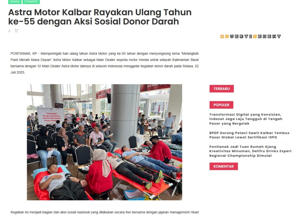 Astra Motor Kalbar Rayakan Ulang Tahun ke-55 dengan Aksi Sosial Donor Darah by Muhammad Arif 23 Agustus 2025 in Silahkan kunjungi https://www.kapuaspost.web.id/2025/08/astra-motor-kalbar-rayakan-ulang-tahun_29.html. Tags: astra Astra Motor kalbar Astra Motor Pontianak astramotor honda kalbar pontianak sepeda motor You Might Like Regional Public Launching New ADV160 The SUV Pride Grand Launching New PCX 160 Truly Exceptional! Tetap hati-hati ya bro sist berkendara saat hujan.