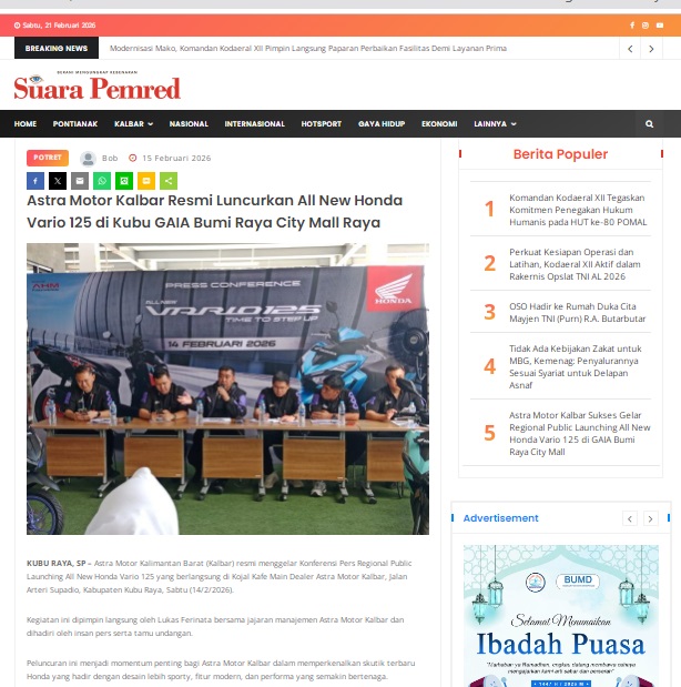 Astra Motor Kalbar Resmi Luncurkan All New Honda Vario 125 di Kubu GAIA Bumi Raya City Mall Raya by masmul 15 Februari 2026 in Silahkan kunjungi https://www.suarapemredkalbar.com/read/potret/15022026/astra-motor-kalbar-resmi-luncurkan-all-new-honda-vario-125-di-kubu-gaia-bumi-raya-city-mall-raya. You Might Like Regional Public Launching New ADV160 The SUV Pride Grand Launching New PCX 160 Truly Exceptional! Tetap hati-hati ya bro sist berkendara saat hujan.