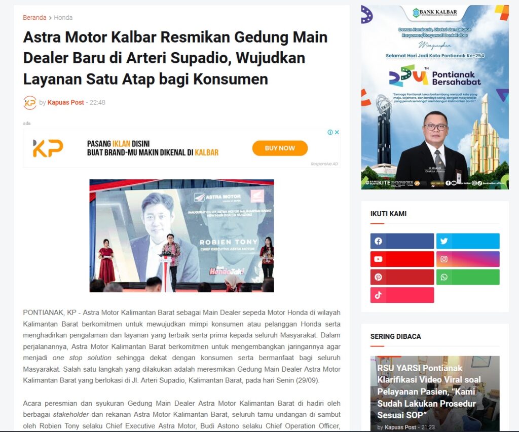 Astra Motor Kalbar Resmikan Gedung Main Dealer Baru di Arteri Supadio, Wujudkan Layanan Satu Atap bagi Konsumen by Muhammad Arif 2 November 2025 in Silahkan kunjungi https://www.kapuaspost.web.id/2025/11/astra-motor-kalbar-resmikan-gedung-main.html#google_vignette. Tags: astra Astra Motor kalbar Astra Motor Pontianak astramotor honda kalbar pontianak sepeda motor You Might Like Regional Public Launching New ADV160 The SUV Pride Grand Launching New PCX 160 Truly Exceptional! Tetap hati-hati ya bro sist berkendara saat hujan.