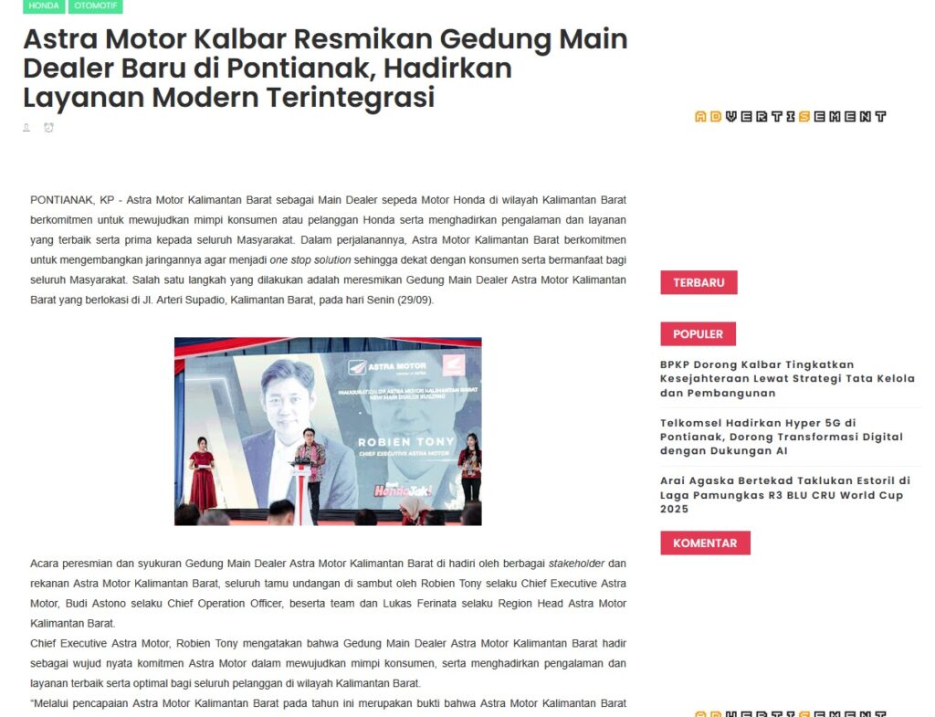 Astra Motor Kalbar Resmikan Gedung Main Dealer Baru di Pontianak, Hadirkan Layanan Modern Terintegrasi by Muhammad Arif 3 Oktober 2025 in Silahkan kunjungi https://www.kapuaspost.web.id/2025/10/astra-motor-kalbar-resmikan-gedung-main.html. Tags: astra Astra Motor kalbar Astra Motor Pontianak astramotor honda kalbar pontianak sepeda motor You Might Like Regional Public Launching New ADV160 The SUV Pride Grand Launching New PCX 160 Truly Exceptional! Tetap hati-hati ya bro sist berkendara saat hujan.