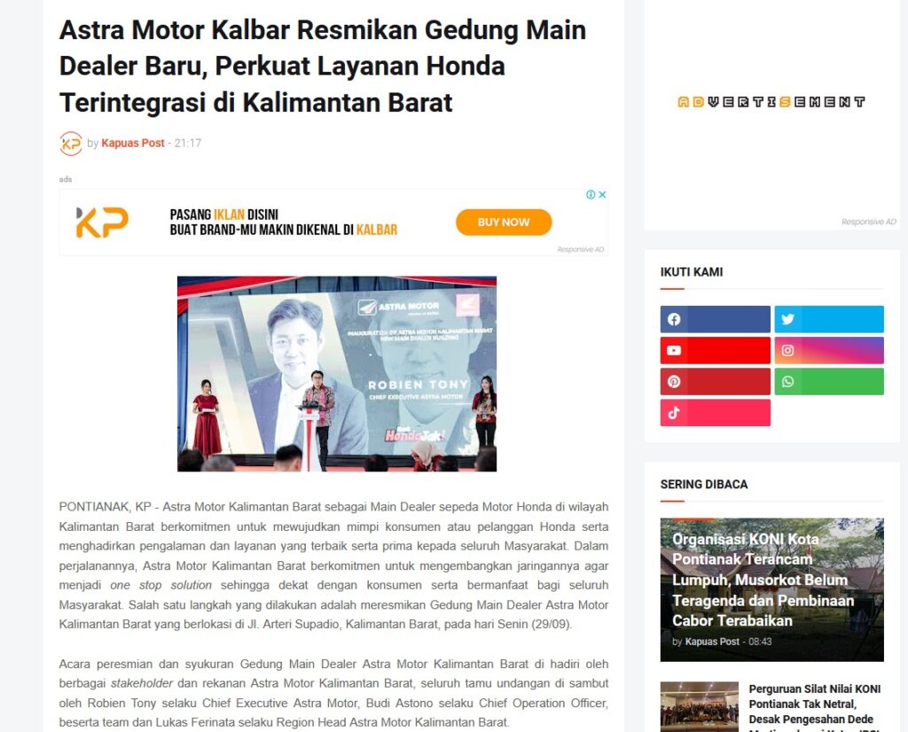 Astra Motor Kalbar Resmikan Gedung Main Dealer Baru, Perkuat Layanan Honda Terintegrasi di Kalimantan Barat by Muhammad Arif 16 Desember 2025 in Silahkan kunjungi https://www.kapuaspost.web.id/2025/12/astra-motor-kalbar-resmikan-gedung-main_16.html. Tags: astra Astra Motor kalbar Astra Motor Pontianak astramotor honda kalbar pontianak sepeda motor You Might Like Regional Public Launching New ADV160 The SUV Pride Grand Launching New PCX 160 Truly Exceptional! Tetap hati-hati ya bro sist berkendara saat hujan.