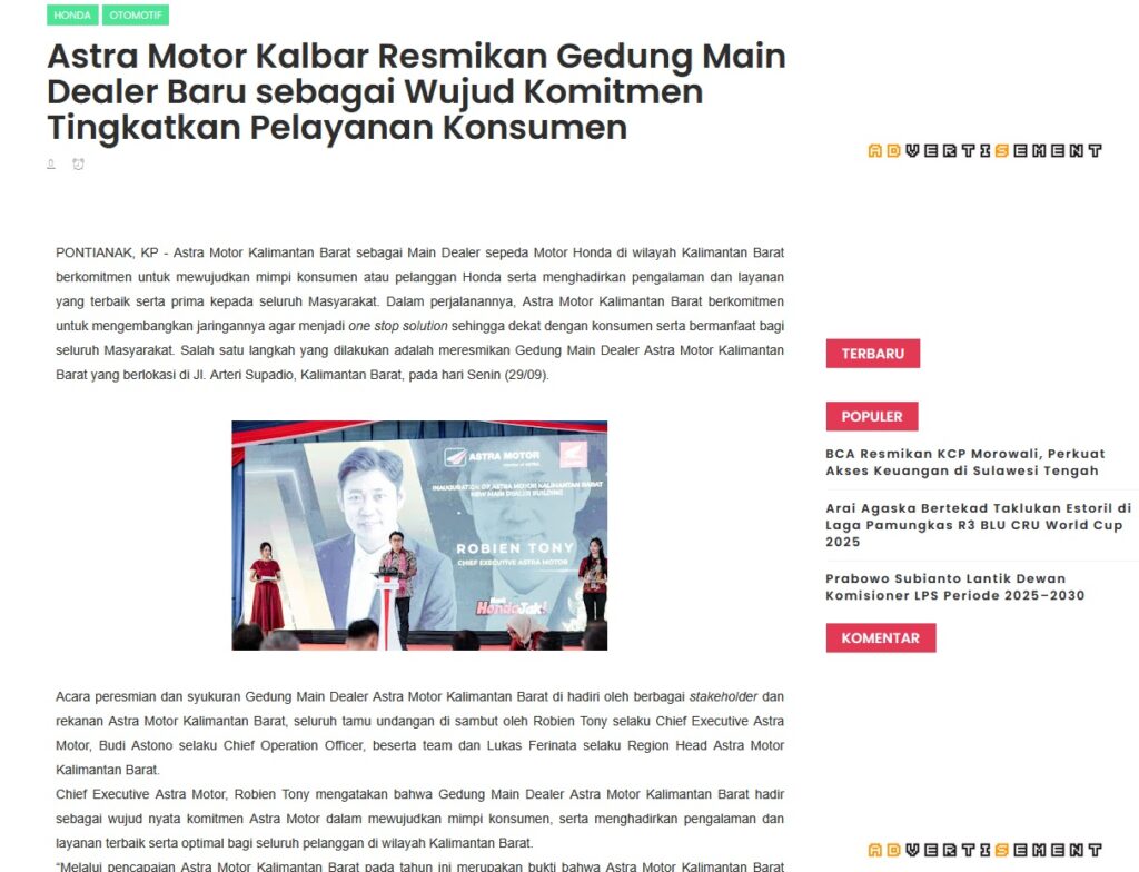 Astra Motor Kalbar Resmikan Gedung Main Dealer Baru sebagai Wujud Komitmen Tingkatkan Pelayanan Konsumen by Muhammad Arif 8 Oktober 2025 in Silahkan kunjungi https://www.kapuaspost.web.id/2025/10/astra-motor-kalbar-resmikan-gedung-main_14.html. Tags: astra Astra Motor kalbar Astra Motor Pontianak astramotor honda kalbar pontianak sepeda motor You Might Like Regional Public Launching New ADV160 The SUV Pride Grand Launching New PCX 160 Truly Exceptional! Tetap hati-hati ya bro sist berkendara saat hujan.