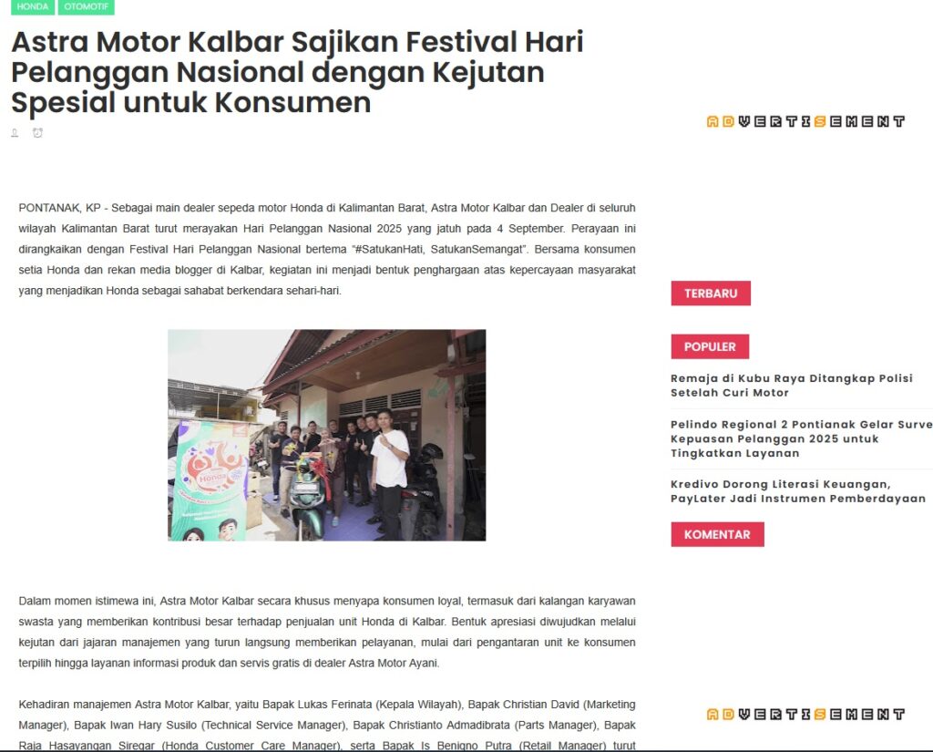 Astra Motor Kalbar Sajikan Festival Hari Pelanggan Nasional dengan Kejutan Spesial untuk Konsumen by Muhammad Arif 15 September 2025 in Silahkan kunjungi https://www.kapuaspost.web.id/2025/09/astra-motor-kalbar-sajikan-festival.html. Tags: astra Astra Motor kalbar Astra Motor Pontianak astramotor honda kalbar pontianak sepeda motor You Might Like Regional Public Launching New ADV160 The SUV Pride Grand Launching New PCX 160 Truly Exceptional! Tetap hati-hati ya bro sist berkendara saat hujan.