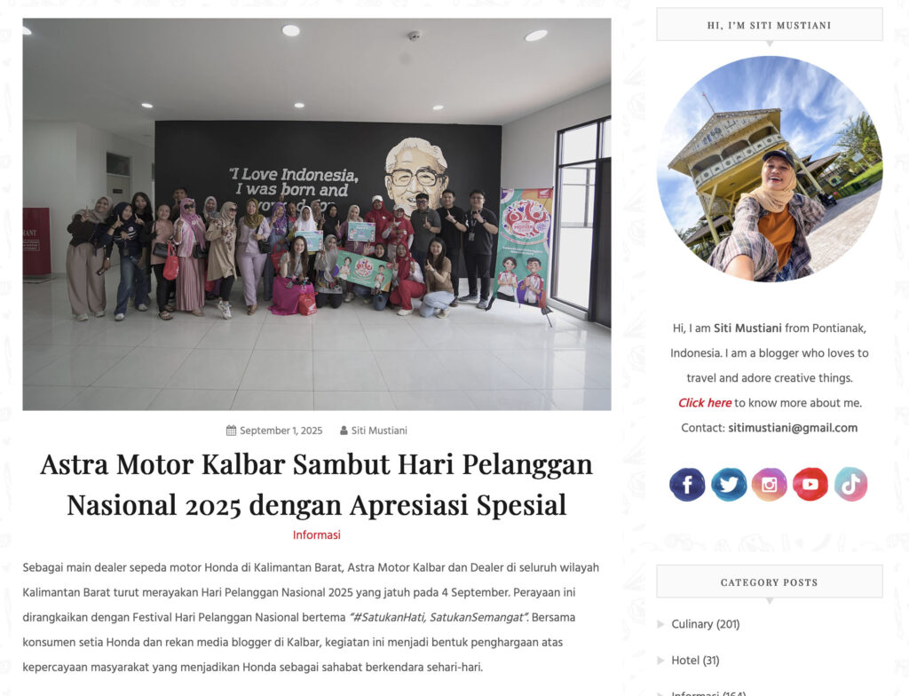 Astra Motor Kalbar Sambut Hari Pelanggan Nasional 2025 dengan Apresiasi Spesial by Siti Mustiani 17 September 2025 in Silahkan kunjungi https://sitimustiani.com/2025/09/astra-motor-kalbar-sambut-hari-pelanggan-nasional-2025-dengan-apresiasi-spesial/. Tags: Astra Motor Kalimantan Barat Hari Pelanggan Nasional Honda Care Honda Kalbar HPN MotorkuX satu hati Siti Mustiani http://www.sitimustiani.com Love to travel and adore creative things ✨ You Might Like Regional Public Launching New ADV160 The SUV Pride Grand Launching New PCX 160 Truly Exceptional! Tetap hati-hati ya bro sist berkendara saat hujan.
