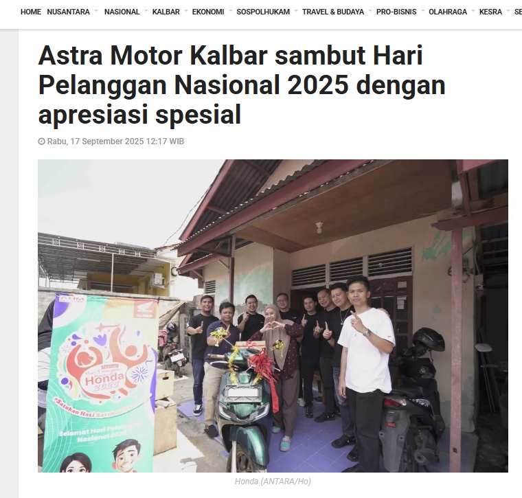 Astra Motor Kalbar sambut Hari Pelanggan Nasional 2025 dengan apresiasi spesial by Dedi 17 September 2025 in Silahkan kunjungi https://kalbar.antaranews.com/berita/665933/astra-motor-kalbar-sambut-hari-pelanggan-nasional-2025-dengan-apresiasi-spesial. You Might Like Regional Public Launching New ADV160 The SUV Pride Grand Launching New PCX 160 Truly Exceptional! Tetap hati-hati ya bro sist berkendara saat hujan.