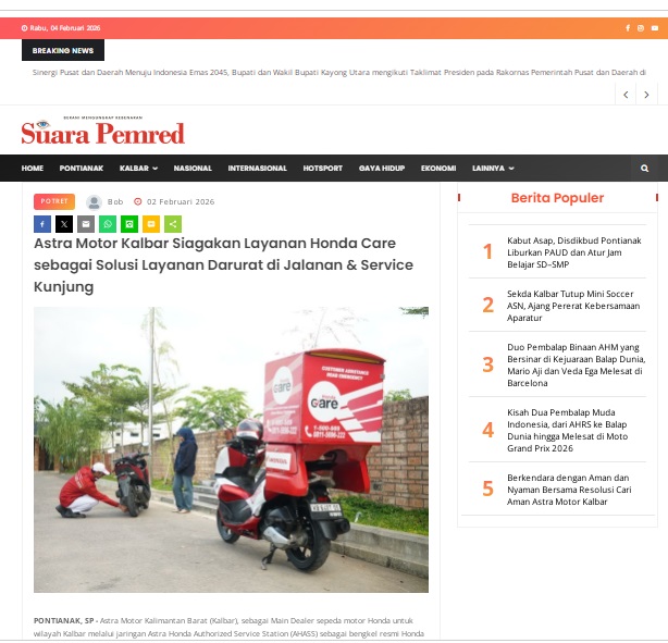 Astra Motor Kalbar Siagakan Layanan Honda Care sebagai Solusi Layanan Darurat di Jalanan & Service Kunjung by masmul 2 Februari 2026 in Silahkan kunjungi https://www.suarapemredkalbar.com/read/potret/02022026/astra-motor-kalbar-siagakan-layanan-honda-care-sebagai-solusi-layanan-darurat-di-jalanan-service-kunjung. You Might Like Regional Public Launching New ADV160 The SUV Pride Grand Launching New PCX 160 Truly Exceptional! Tetap hati-hati ya bro sist berkendara saat hujan.