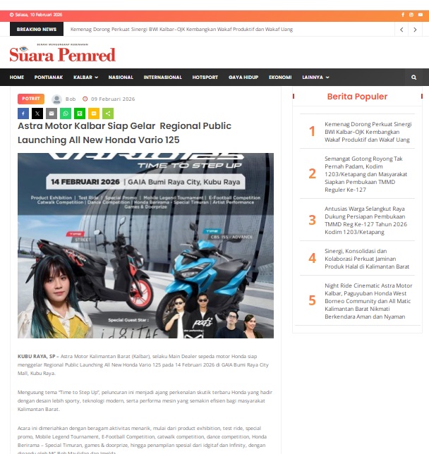 Astra Motor Kalbar Siap Gelar Regional Public Launching All New Honda Vario 125 by masmul 9 Februari 2026 in Silahkan kunjungi https://www.suarapemredkalbar.com/read/potret/09022026/astra-motor-kalbar-siap-gelar-regional-public-launching-all-new-honda-vario-125. You Might Like Regional Public Launching New ADV160 The SUV Pride Grand Launching New PCX 160 Truly Exceptional! Tetap hati-hati ya bro sist berkendara saat hujan.